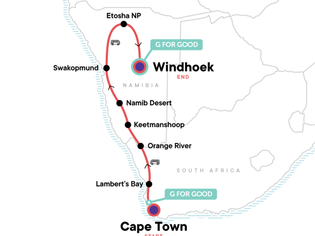 Your Discover Moment: Swakopmund. Fish River Canyon entrance. Sossusvlei Dunes and Sesriem Canyon entrance. Etosha National Park entrance with wildlife safari drives. Wine tasting in Lambert's Bay. All transport between destinations and to/from included activities.