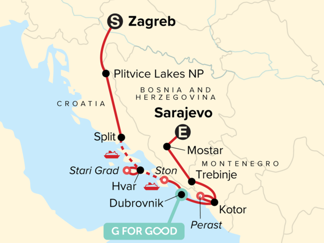 Your Foodie Moment: Sarajevo Food Tour, Sarajevo. Plitvice National Parks walk. Split guided walking tour. Hvar guided walking tour. Stari Grad guided walking tour. Malo Grablje walk. Ston walk with oyster and wine tasting. Self guided Red History Museum visit. Boat cruise to Our Lady of the Rocks, Kotor orientation walk, Winery tour and tasting, Hercegovačka Gračanica Temple views, UNESCO Necropolis tomb stone visit, Stari Most visit, All transport between destinations and to/from included activities