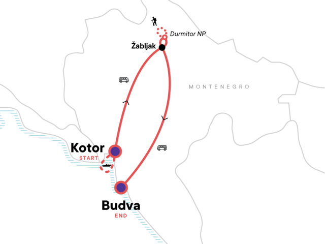 Your Big Night Out Moment: Budva. Orientation walk of Kotor. Hike to Kotor Fortress. oat tour on the Bay of Kotor. See Nevidio Canyon. Hike to Crno Jezero (Black Lake) in Durmitor National Park. Visit the Lower Ostrog Monastery. Orientation walk of Budva's old town. Transport to/from all included activities and between all destinations.
