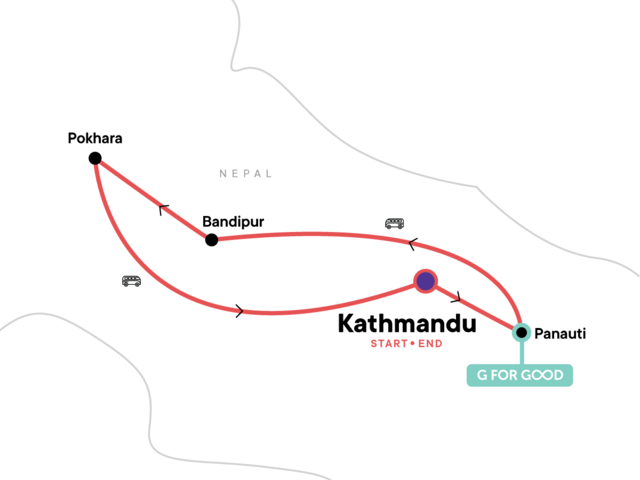 Your Big Night Out Moment: Lakeside Bar, Pokhara. Patan Durbar Square Tour. Swayambhunath Temple Visit. Hike to Panauti Community Homestay. Bike Tour of Panauti Region. Bandipur Orientation Walk. Ramkot Village Hike. Pokhara Orientation Walk. All transport between destinations and to/from included activities.
