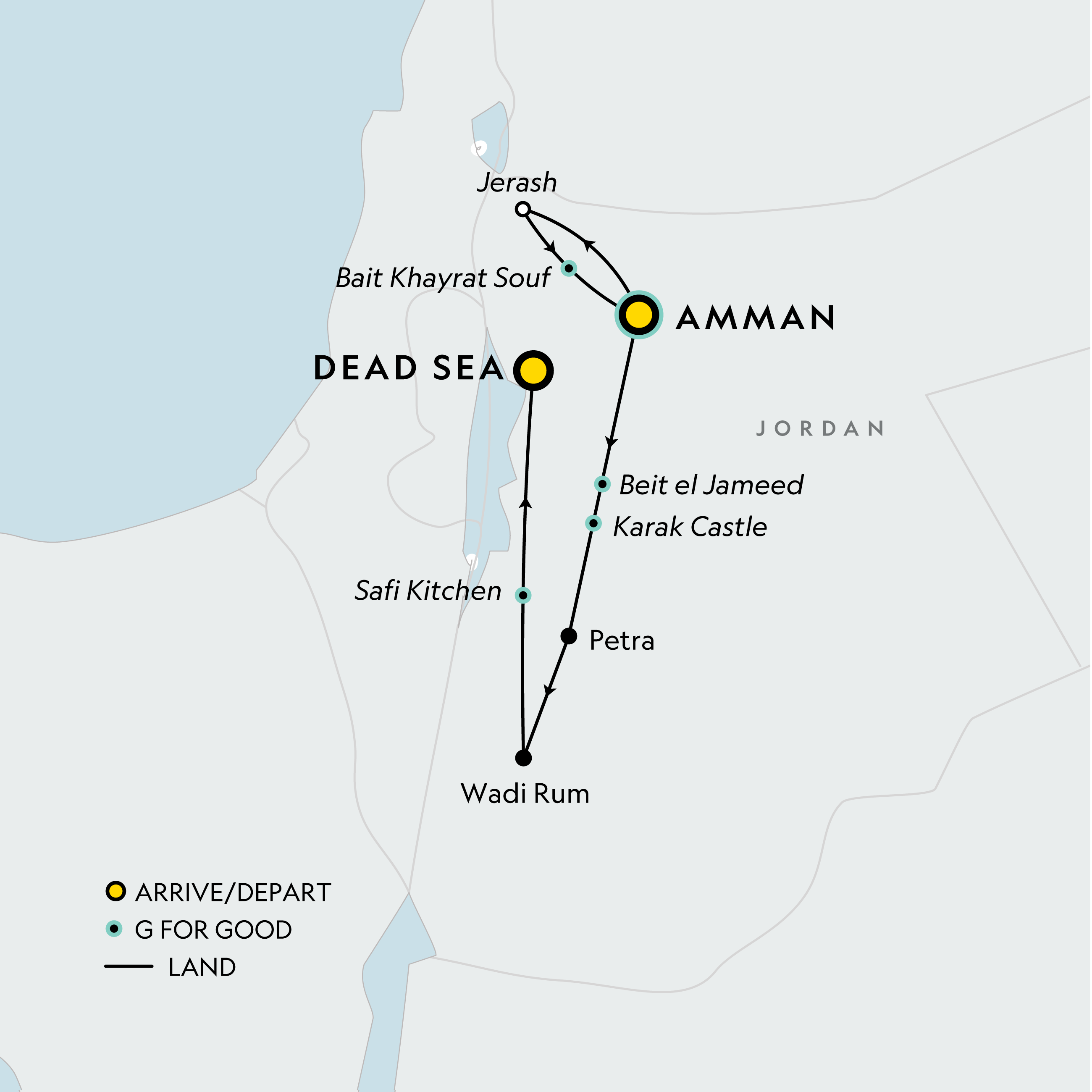Signature Moment: Wadi Rum Stargazing, Wadi Rum. Arrival transfer. Welcome Dinner. Guided tour of Jerash archaeological site. Private post-closure visit of Amman Citadel and the Jordan Archaeological Museum. Visit Karak Castle. Petra by Night visit. Guided tour of Petra. Dinner in a private cave at Little Petra. 4x4 tour of Wadi Rum Desert. Visit the Pink Lake and Salt Beach at the Dead Sea. Bethany archaeological site and Mount Nebo visit. Farewell Dinner. Engaging Discussions with the National Geographic Expedition Expert throughout. Porterage at hotels and when getting on and off of vehicles. Tips are included for all activities, meals and porterage, except for your Expedition Leader. Departure transfer. All transport between destinations and to/from included activities.