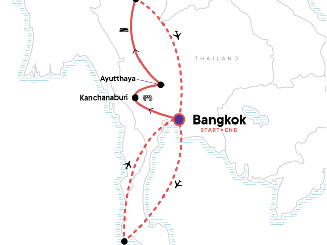 Your Foodie Moment: Cooking Class, Chiang Mai. Arrival transfer. Guided tour of Bangkok klongs and Wat Po. Temple visits in Ayutthaya. Bridge on the River Kwai visit and Erawan National Park. Wat Phra That Doi Suthep. Free time on Phuket beaches.