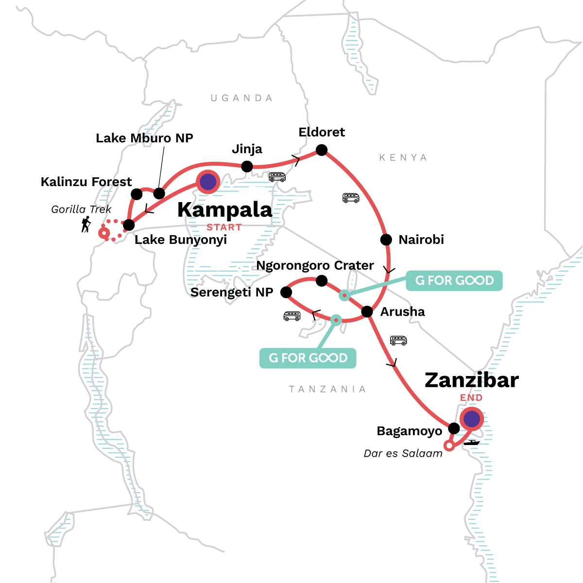 Witness the wildlife of Uganda, lounge on the sunny beaches of Zanzibar, and spend 19 days journeying overland across East Africa. From tracking mountain gorillas through remote forest for a once-in-a-lifetime experience, to pursuing the elusive "big five" across open savannah and camping in the remote wilderness, this trip is for the adventurous spirit dreaming of reaching some of the wonders of this vast continent.