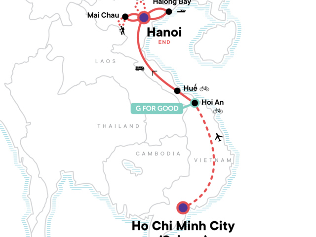 Your Local Living Moment: Mai Chau Homestay, Mai Châu. Cu Chi Tunnels entrance and tour. Escorted cycling trips. Entrance to the Emperor's Tomb and Citadel. Countryside hike. Halong Bay overnight boat trip with seafood meals. Sea-kayaking and cave visit. Internal flight. All transport between destinations and to/from included activities.