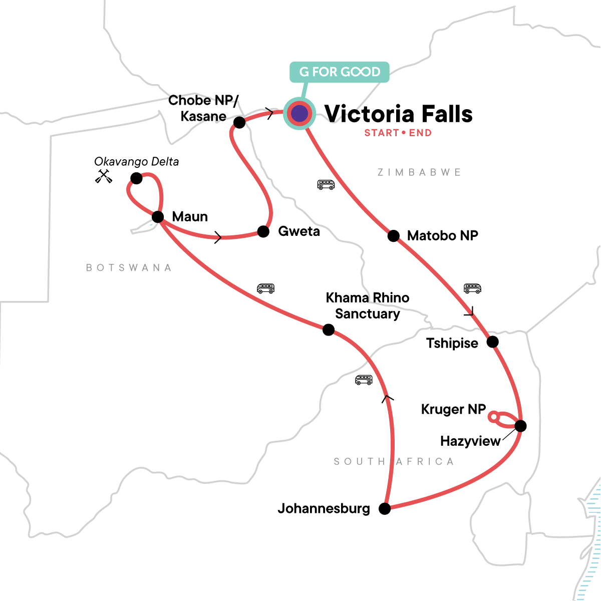 Hop aboard one of our Landos (overland adventure vehicle) and cruise through Botswana, South Africa, and Zimbabwe. 15 days of wildlife, captivating wilderness, and remote camp outs making for an epic overlanding adventure. Find the “big five” in Kruger National Park, feel the spray of Victoria Falls, search for rhinos on foot in Matobo National Park, sing songs around the fire with locals, travel into the delta by mokoro canoe and spend time getting to know Africa on a deeper level.